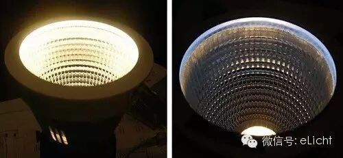这是同一个灯,左边看上去很眩光啊!是反射器没做好?非也,右边是我用电工胶布贴住了白色边圈,反射眩光立即没了!一道白边,破十年功力啊!