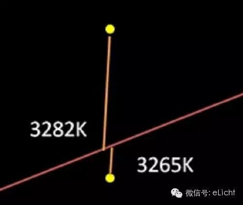 他们距离黑体曲线最近处的数值分别是3265K和3282K,看上去只相差20K,但实际上他们的距离可远了。