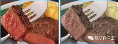 图:同样的食物在不同R9显色指数灯具下的效果。
