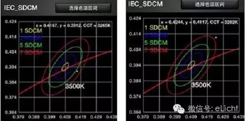 回头看图,一个点距离“完美”光色在5step(绿圈)以内,我们认为它是比较漂亮的光色。另一个点已经跑出7step(红圈),人眼可以明显发现他的偏色。
